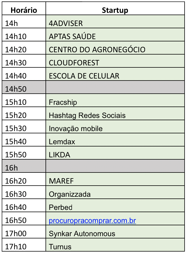 - A apresentação não é aberta ao público. O acesso à Banca acontece unicamente no horário agendado. A apresentação é restrita à Startup e à banca presente.