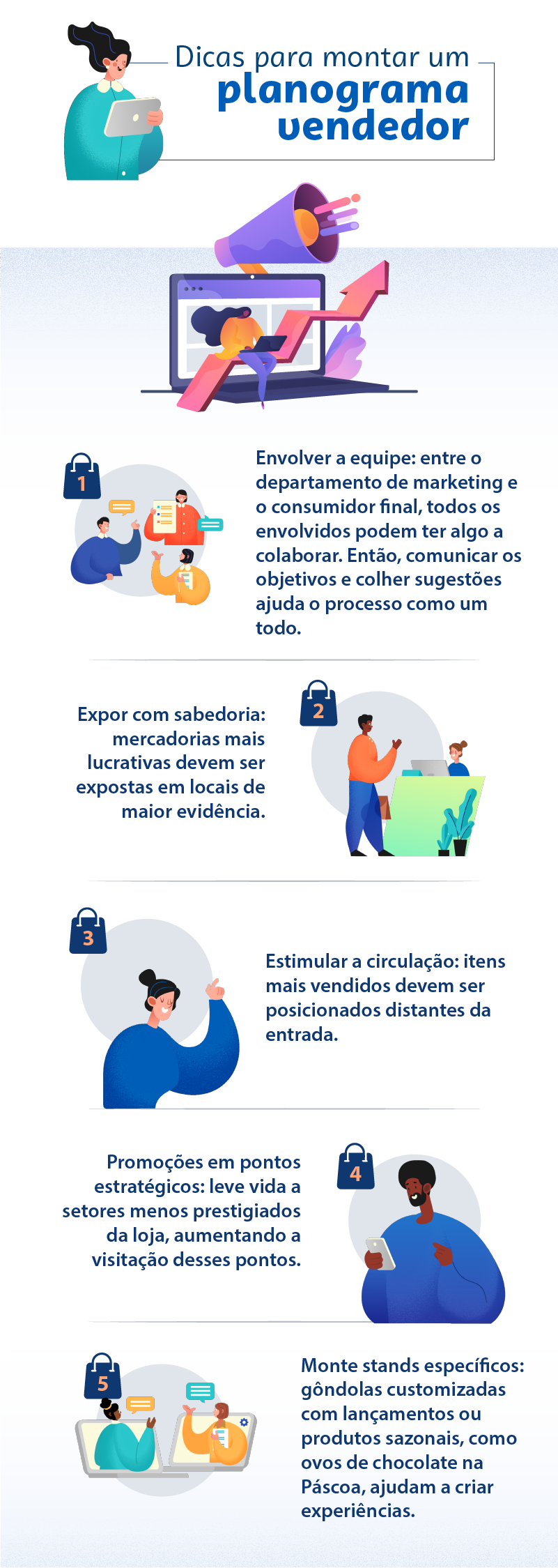 O planograma ou plano de gôndola é uma ferramenta que ajuda a organizar os produtos em um ponto de venda. É um documento em forma de desenho gráfico, para que a pessoa responsável pela reposição de itens não tenha dúvidas de onde colocar o produto.