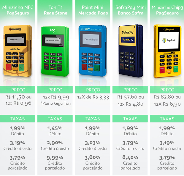 A quarta opção mais barata do mercado é a SafraPay Mini, que custa 12X de R$ 4,80 ou R$ 57,60. Atualmente, suas taxas são de 1,98% no débito, 3,79% no crédito à vista e 8,40% no crédito.