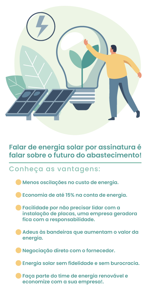 A partir de 2015, após a Agência Nacional de Energia Elétrica (Aneel) perceber que a geração não crescia de acordo com a demanda, foi regulamentada a geração compartilhada, que permitiu que a energia gerada fosse vendida a terceiros por meio de créditos. Foi este modelo que viabilizou a criação da assinatura de energia solar, que pode trazer vantagens consideráveis para o seu negócio, tornando-o mais rentável ao reduzir os custos.