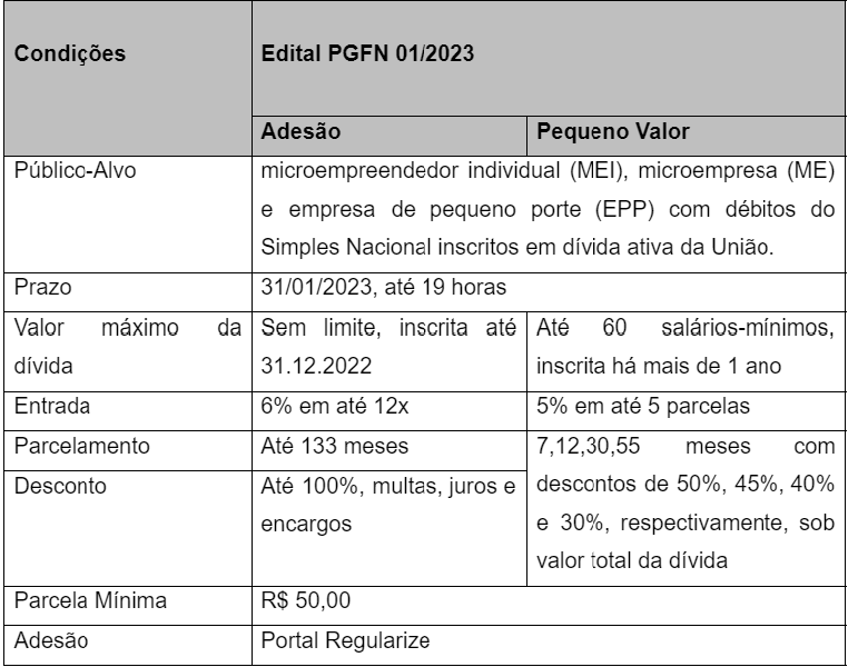A Procuradoria-Geral da Fazenda Nacional publicou no dia 17 de janeiro de 2023 o Edital PGDAU nº 1/2023, que traz a possibilidade de os contribuintes regularizarem seus débitos do Simples Nacional inscritos em dívida ativa, evitando assim a exclusão do Simples Nacional e permitindo o ingresso ou reingresso no regime simplificado. Entretanto, o prazo é curto e termina no dia 31 de janeiro.