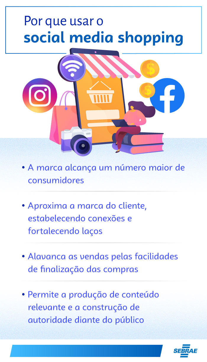 - Instagram: a rede criou o perfil comercial e a modalidade compras, conhecido como Instagram Shopping, o qual possui recursos especiais para quem quer vender pelo canal. Nesse perfil, é possível ativar a função compras, cadastrar os produtos e colocar um link de vendas nas publicações, com duas possibilidades: levar os usuários para a loja virtual ou permitir a finalização da compra diretamente no aplicativo;