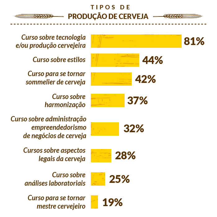 A maioria dos empresários (79%) declarou que já realizou curso sobre tecnologia e/ou produção cervejeira. Na sequência, predominam os cursos sobre , sommelier, estilo e harmonização.