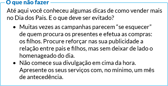 Aqui vale também fazer parcerias com outros empreendimentos, como lojas de cosméticos e cervejarias. E como o Dia dos Pais tem uma energia familiar, ofereça pacotes para que os filhos e filhas também participem desse dia especial junto com eles.