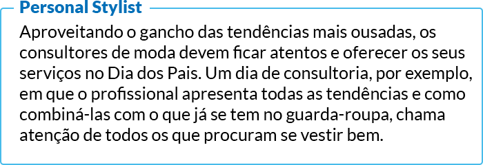 Independentemente do estilo de pai (tradicional, descolado, nerd ou aventureiro), sempre vão existir produtos personalizados que são a cara de cada perfil. Pensando nisso, o Sebrae separou algumas tendências que vão ajudar a sua empresa a inovar no evento do dia dos pais.