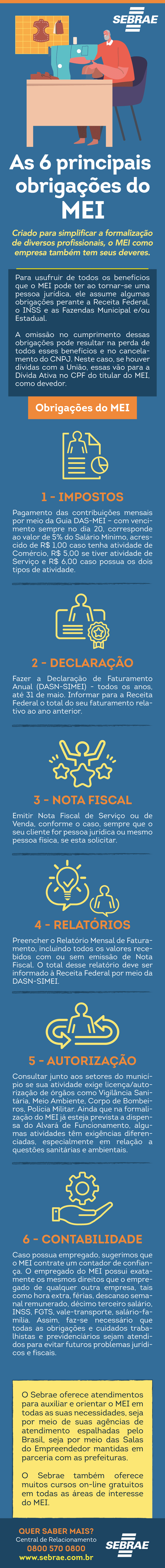 De 22 a 26 de maio, o Sebrae promove a Semana do MEI com vários pontos e tendas de atendimento em todo o Brasil. Infográfico detalha as obrigações do MEI.