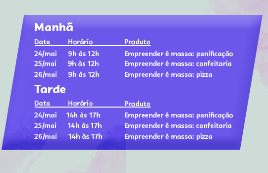 Teremos atendimentos gratuitos, informações e treinamentos destinados a microempreendedores individuais e potenciais empreendedores em temas como: ferramentas digitais, marketing, finanças, vendas e crédito, entre outros. Além de oficinas de técnicas de panificação, pizzaria e confeitaria.
